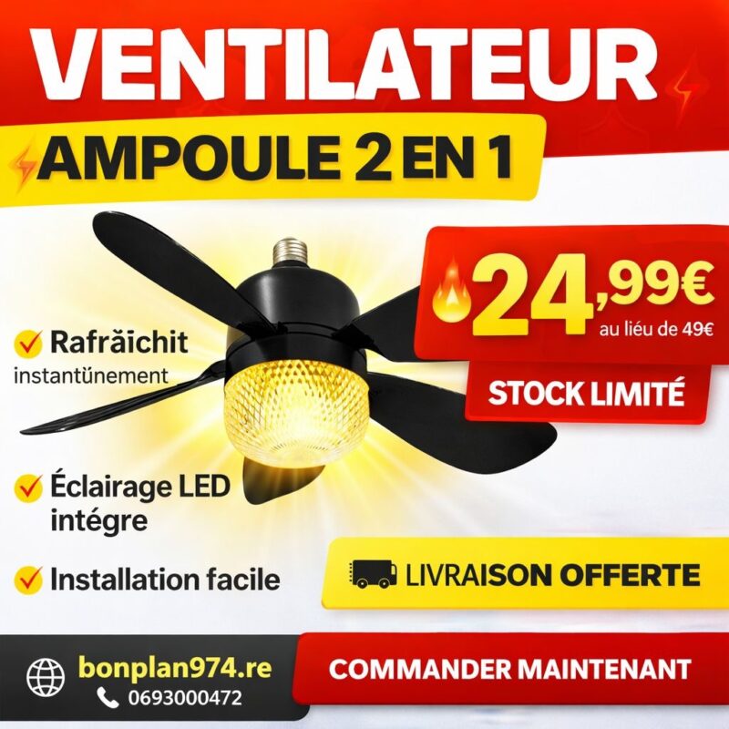 Transformez votre espace avec ce ventilateur plafonnier nouvelle génération, alliant performance de ventilation et éclairage LED élégant. Grâce à ses pales aérodynamiques et son moteur silencieux, il diffuse une brise agréable tout en assurant une consommation énergétique réduite. Son éclairage LED intégré, doté d’un design cristal raffiné, apporte une touche chic et moderne à votre pièce. Facile d'installation car se visse comme une ampoule, pratique pour les fortes chaleurs de notre île.