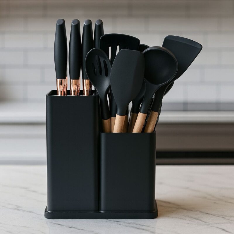Set d'Ustensile de Cuisine au design élégant. Transformez votre cuisine en un espace moderne, chic et parfaitement organisé avec ce Set d'Ustensile. Conçu pour allier esthétique, durabilité et confort d'utilisation, ce kit complet est l'allié indispensable de toutes vos préparations culinaires.