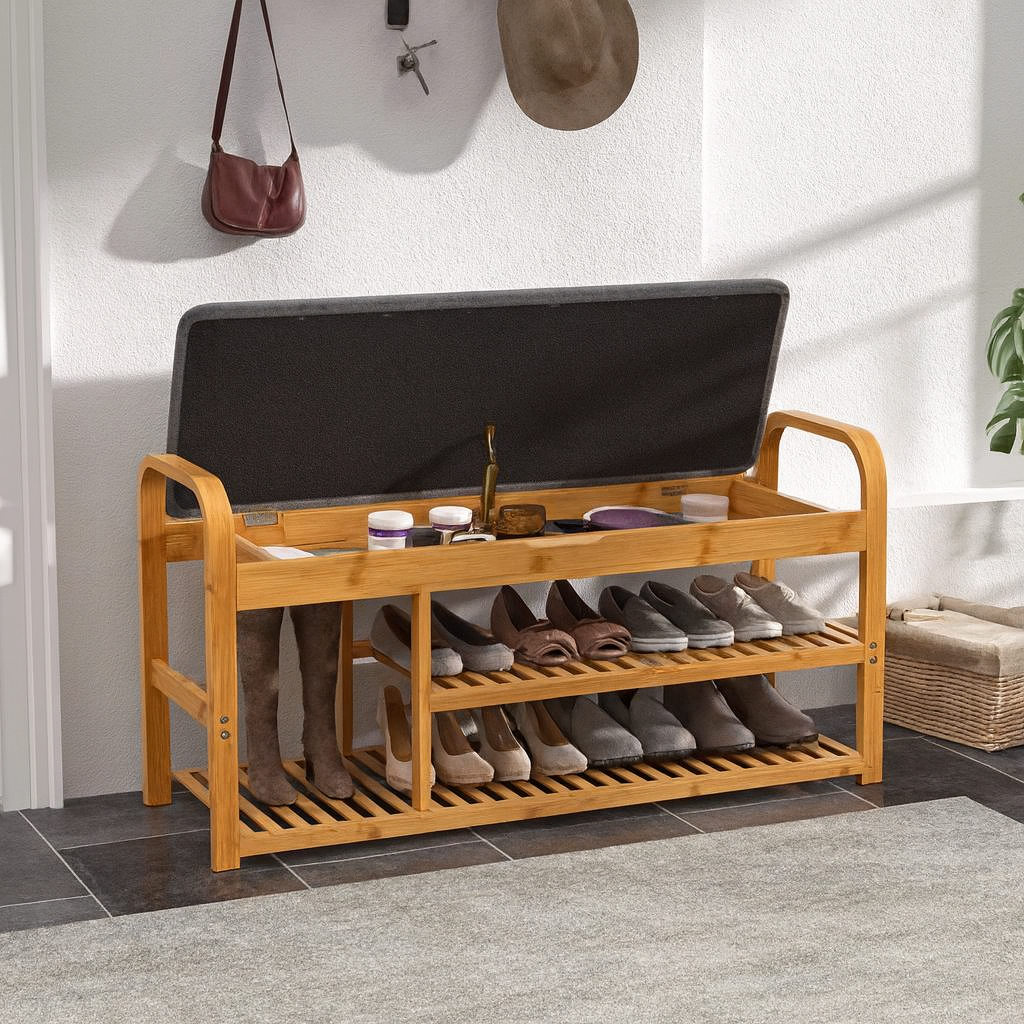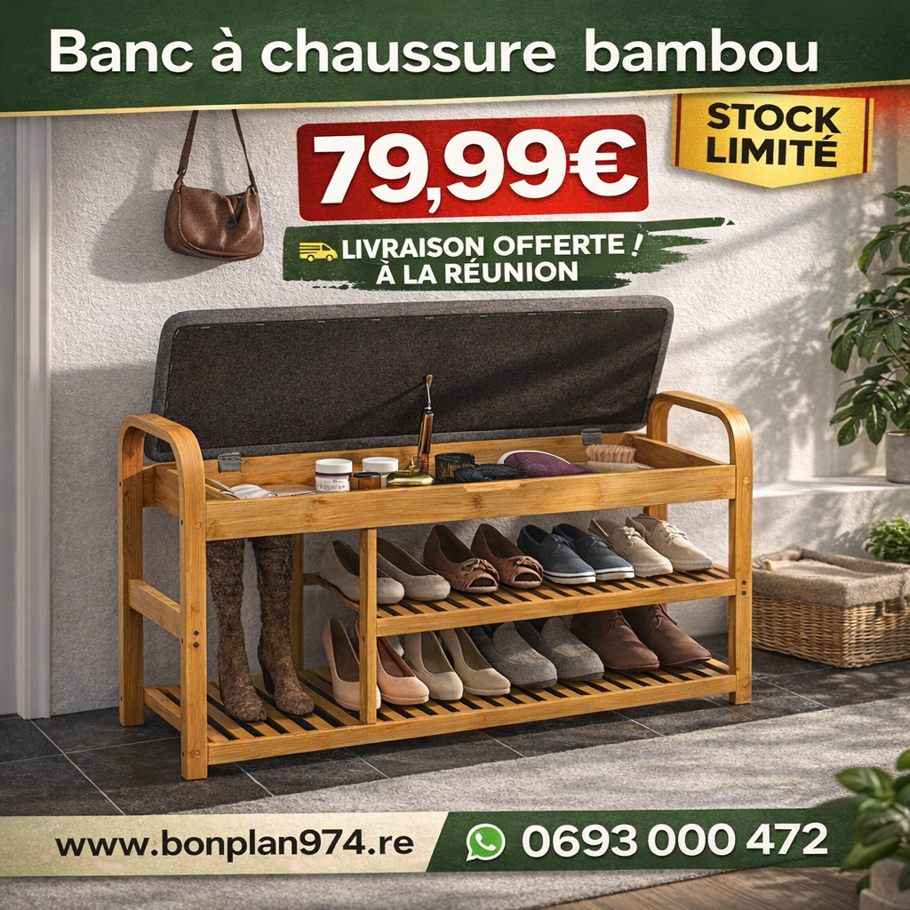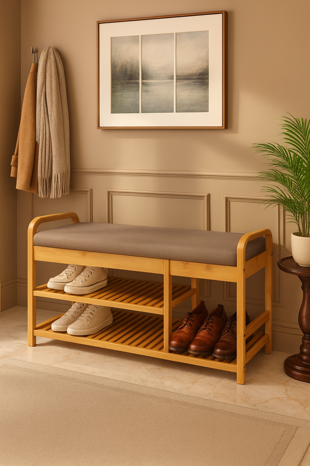 Un banc chic en Bambou 3en1 avec assise rembourrée et étagères pour organiser toutes vos chaussures. Style et praticité au quotidien.