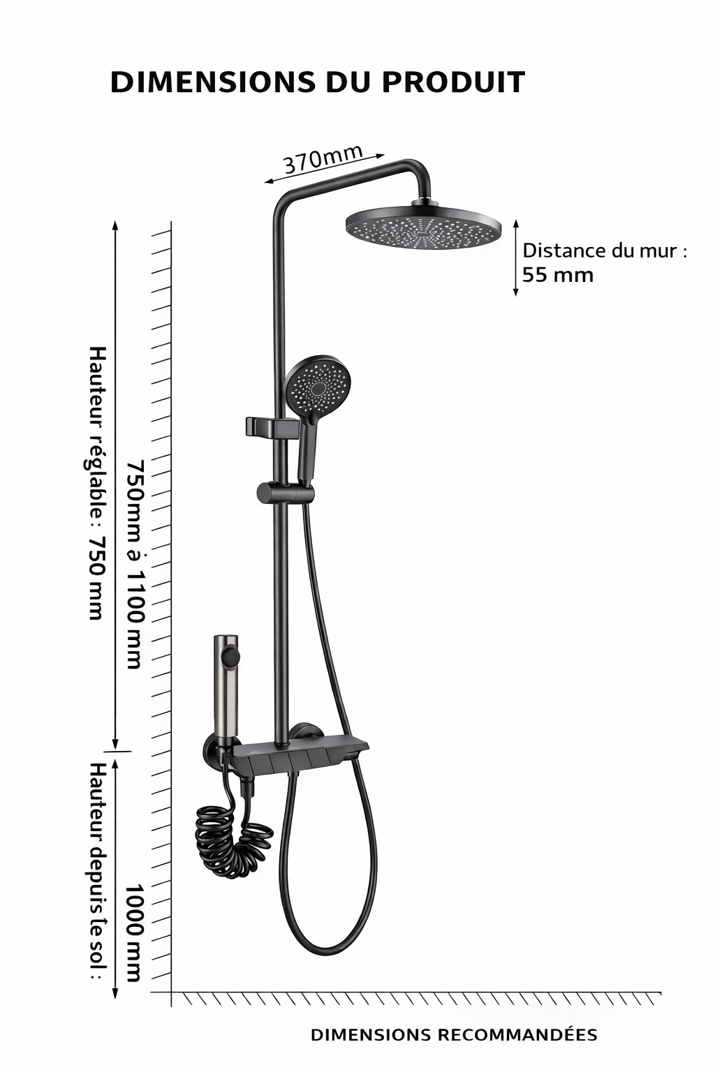 Apportez confort et élégance à votre salle de bain avec cette colonne de douche design noir mat. Équipée d’un grand pommeau effet pluie, elle offre une expérience de douche relaxante et homogène. Sa hauteur réglable de 750 à 1100 mm permet de s’adapter facilement à toutes les salles de bain.