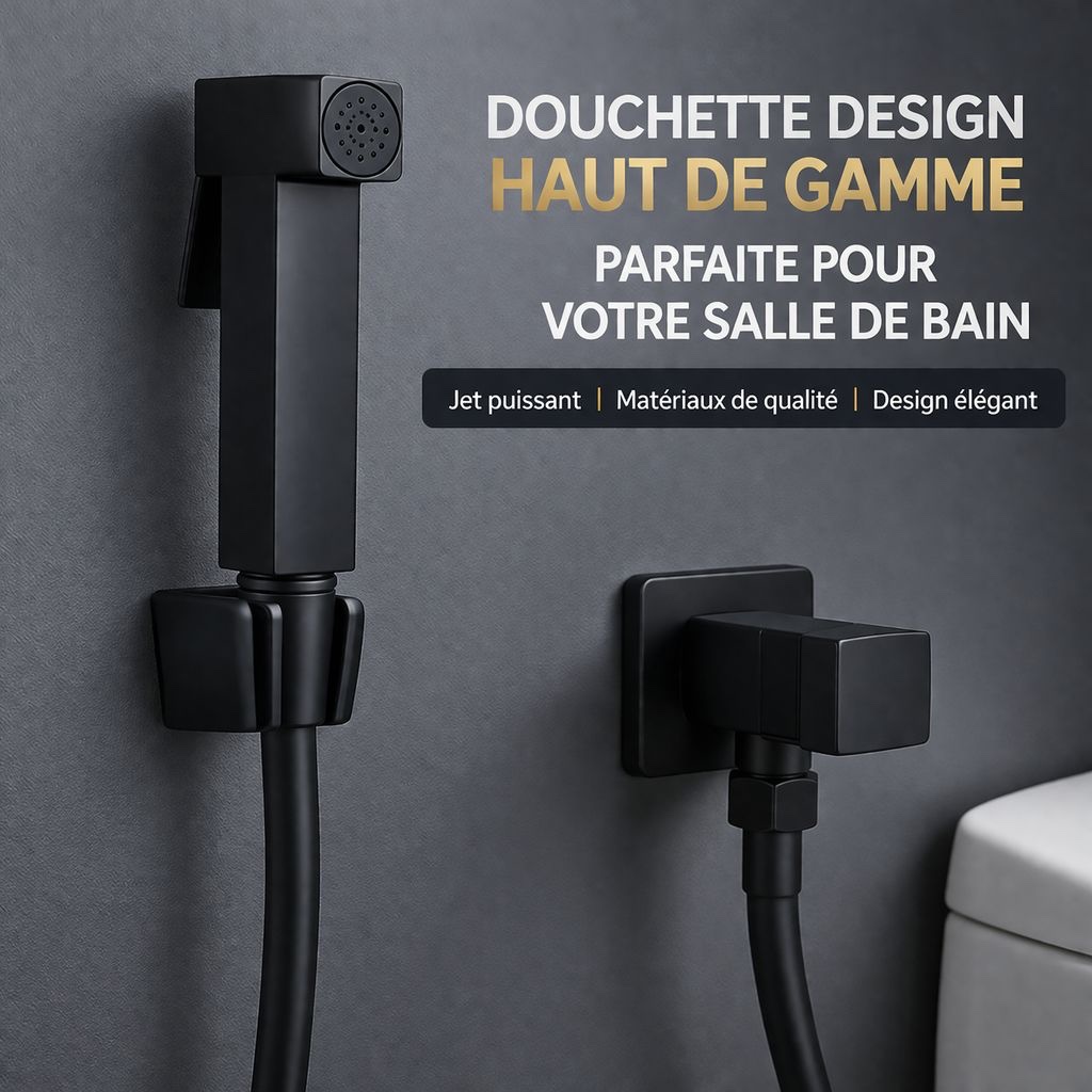 Douchette hygiénique design pour salle de bain et WC. Son style moderne noir mat apporte une touche élégante tout en offrant un jet d’eau puissant et précis. Elle est idéale pour l’hygiène personnelle, le nettoyage des toilettes ou l’entretien de la salle de bain. Son installation est simple et compatible avec la majorité des arrivées d’eau standards.