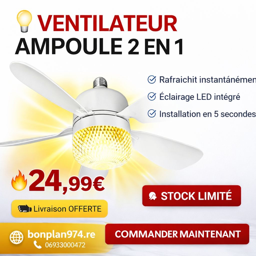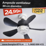 Transformez votre espace avec ce ventilateur plafonnier nouvelle génération, alliant performance de ventilation et éclairage LED élégant. Grâce à ses pales aérodynamiques et son moteur silencieux, il diffuse une brise agréable tout en assurant une consommation énergétique réduite. Son éclairage LED intégré, doté d’un design cristal raffiné, apporte une touche chic et moderne à votre pièce. Facile d’installation car se visse comme une ampoule, pratique pour les fortes chaleurs de notre île.