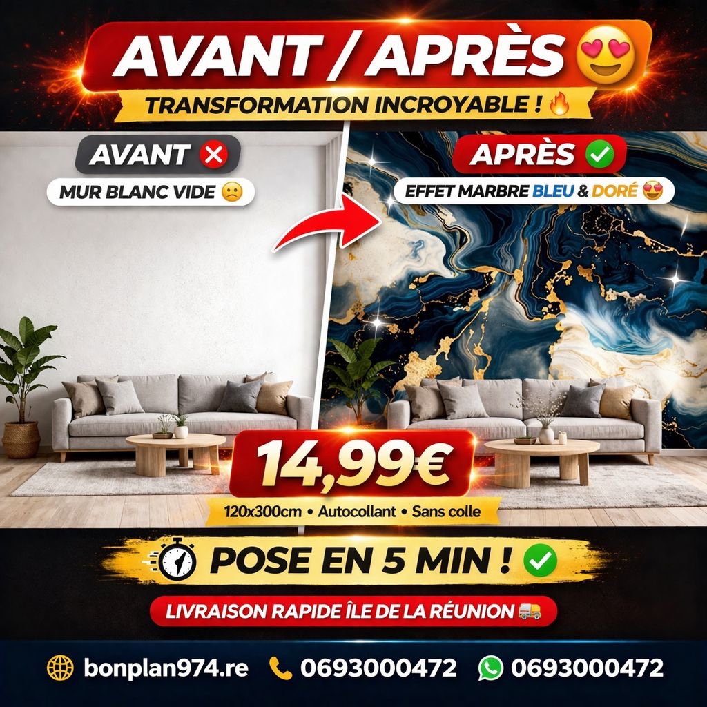 Papier peint PVC autocollant effet marbre haut de gamme (120×300 cm). Pose ultra facile en 5 minutes, sans colle ni outils. Résistant, épais et parfait pour donner un style moderne et élégant à votre salon, chambre ou bureau.