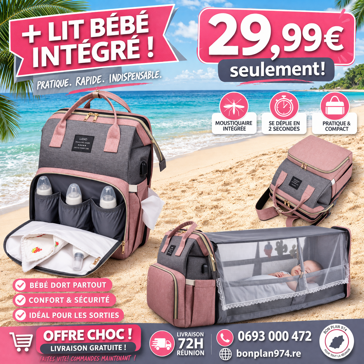 Sac à Langer imperméable multifontion 3en1 avec lit bébé intégré, pratique, hygiénique et idéal pour les parents actifs.